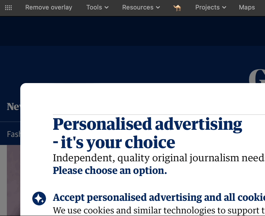 Click the bookmarklet to remove paywalls, login or cookie prompts, and other annoying overlay-style modals that prevent you from seeing the content underneath and scrolling.
